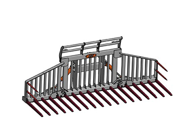 Die Grüngutgabel mit hydraulischer Seitenaufklappung ist in einer Breite von 430 cm oder 488 cm erhältlich.